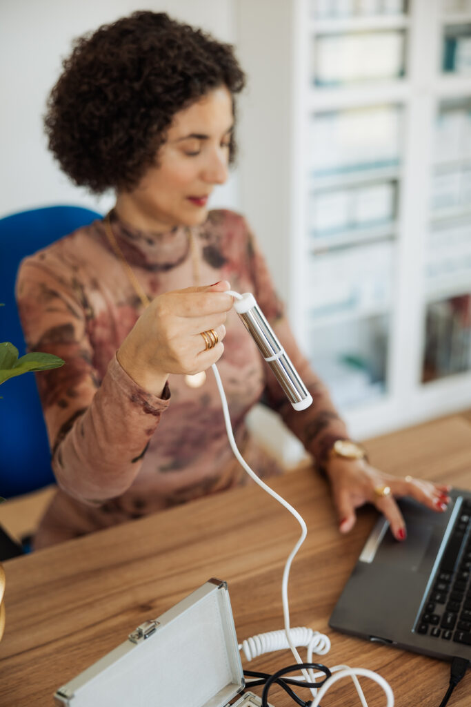 Para a realização da Análise Quântica, basta segurar o sensor do Analisador Quântico com a mão. O Analisador Quântico mede as ondas eletromagnéticas emitidas pelas células do organismo. O Analisador Quântico utiliza o Princípio da Medicina Quântica, que considera a matéria e a energia, à escala dos átomos e das partículas subatómicas. O aparelho compara os valores das leituras obtidas pelo organismo com os valores padrão de referência, apresentando os mesmos em uma escala de valores e cores. No final da consulta, é entregue um relatório final dos resultados. Os resultados do Analisador Quântico são apenas para referência, não são uma conclusão diagnóstica. Contraindicado a portadores de pacemaker e grávidas. Certificação CE.